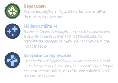 | ✅ Assez d’énergie pour être équipé d’armes de soutien et menacer les petit mech – Flankers: Ceux qui n’attaquent pas l’ennemi de face mais le contournent. Le champ de soin du M.D. donne un avantage cruciale aux alliés et au combat. |