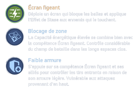 | ⛔ Dépend de son agilité à utiliser sa barrière de stase et de ses alliés pour contrôler les tirs entrants en raison de son armure légère. vulnérable aux attaques provenant du haut. |